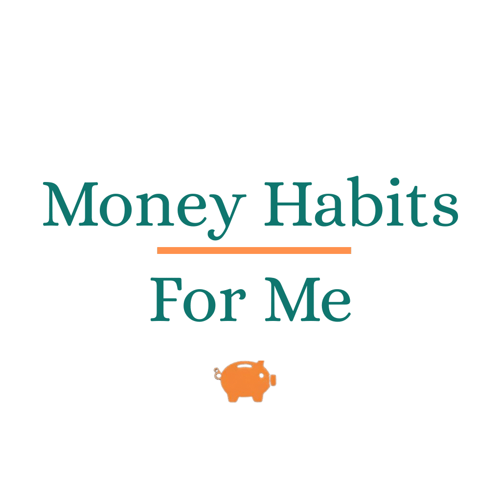 Text reads “Money Habits For Me” with an orange line and piggy bank icon below the text, highlighting simple personal finance tips on a clean white background.