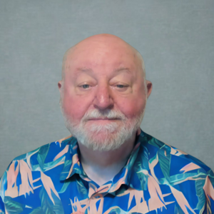 An older man with a bald head and white beard wears a colorful shirt with a leaf pattern, posing in front of a plain gray background.